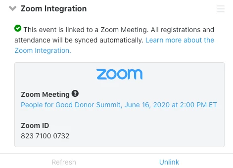 If you need to unlink or change the meeting or webinar, you can select Unlink. This will not remove data that has already been added, but it will stop any future syncing from occurring. You can then link to a different Zoom Meeting or Zoom Webinar.